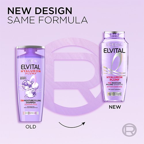 L'Oréal Paris Elvital Hyaluron Plump shampoo er beriget med hyaluronsyre. Dette molekyle som findes naturligt i kroppen, absorberer 1000 gange sin egen vægt i vand og hjælper med at give fyldigt hår.